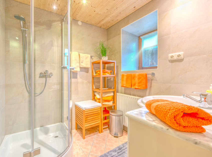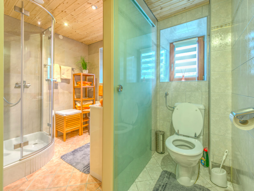 Die Dusche ist durch eine Schiebetüre vom WC getrennt und bietet praktischen Komfort auf kleinem Raum.
